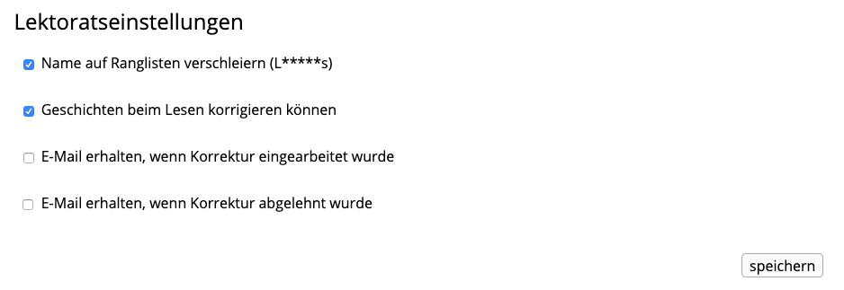 ) Im zweiten Bereich (Lektoratseinstellungen), kannst du auswählen, ob du Texte direkt beim Lesen korrigieren möchtest. Außerdem ist es möglich, einzustellen, dass du über die Einarbeitung oder Ablehnung einer Korrektur informiert wirst.